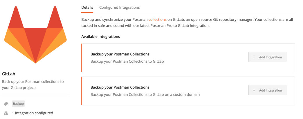 Click View Details to see information about GitLab and how it can back up your Postman Collections to your GitLab projects or self-hosted domains.