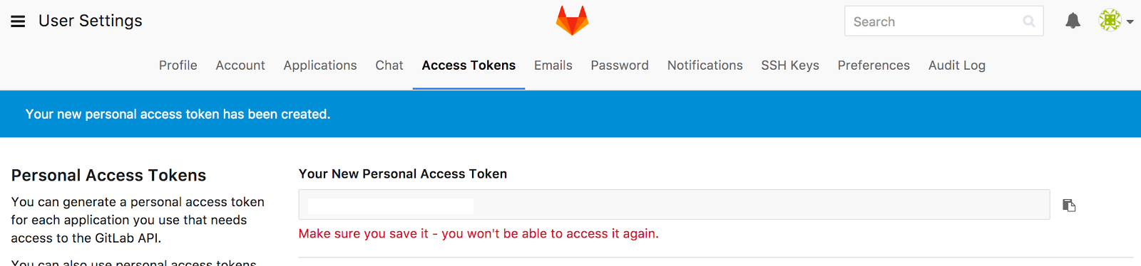 If you don’t already have a Personal Access Token from GitLab, generate a new one.