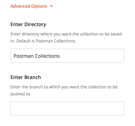 In "Advanced Options" you can enter a custom directory name or leave "Postman Collections" as the default. You can specify a branch for commit or the default branch of the repository will be used. Make sure you have write access to the branch you are trying to push your changes.