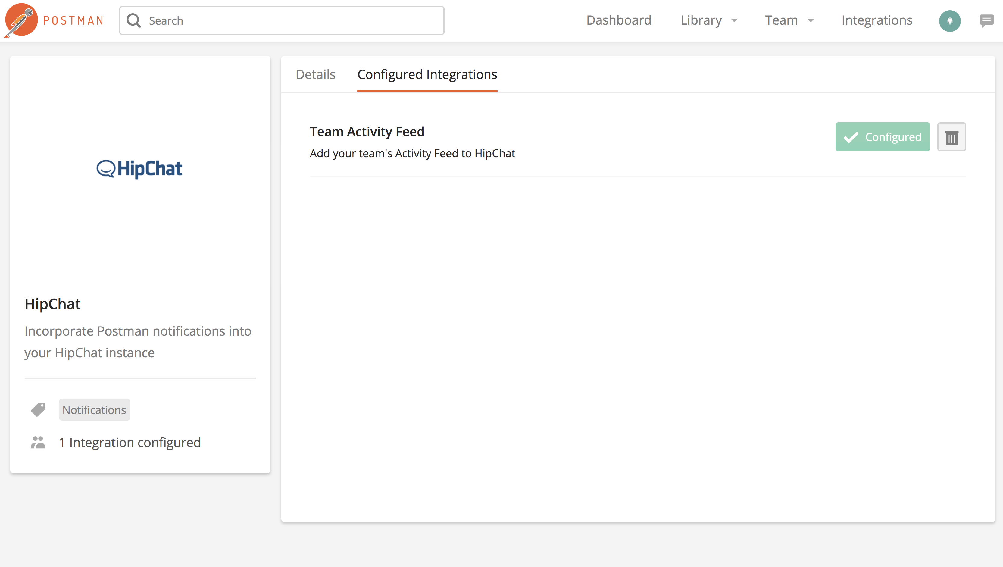 This integration allows you to get real-time updates of what is happening in your Postman team. You can configure HipChat with Postman to monitor results, view a team’s activity feed, and use a HipChat Webhook URL.