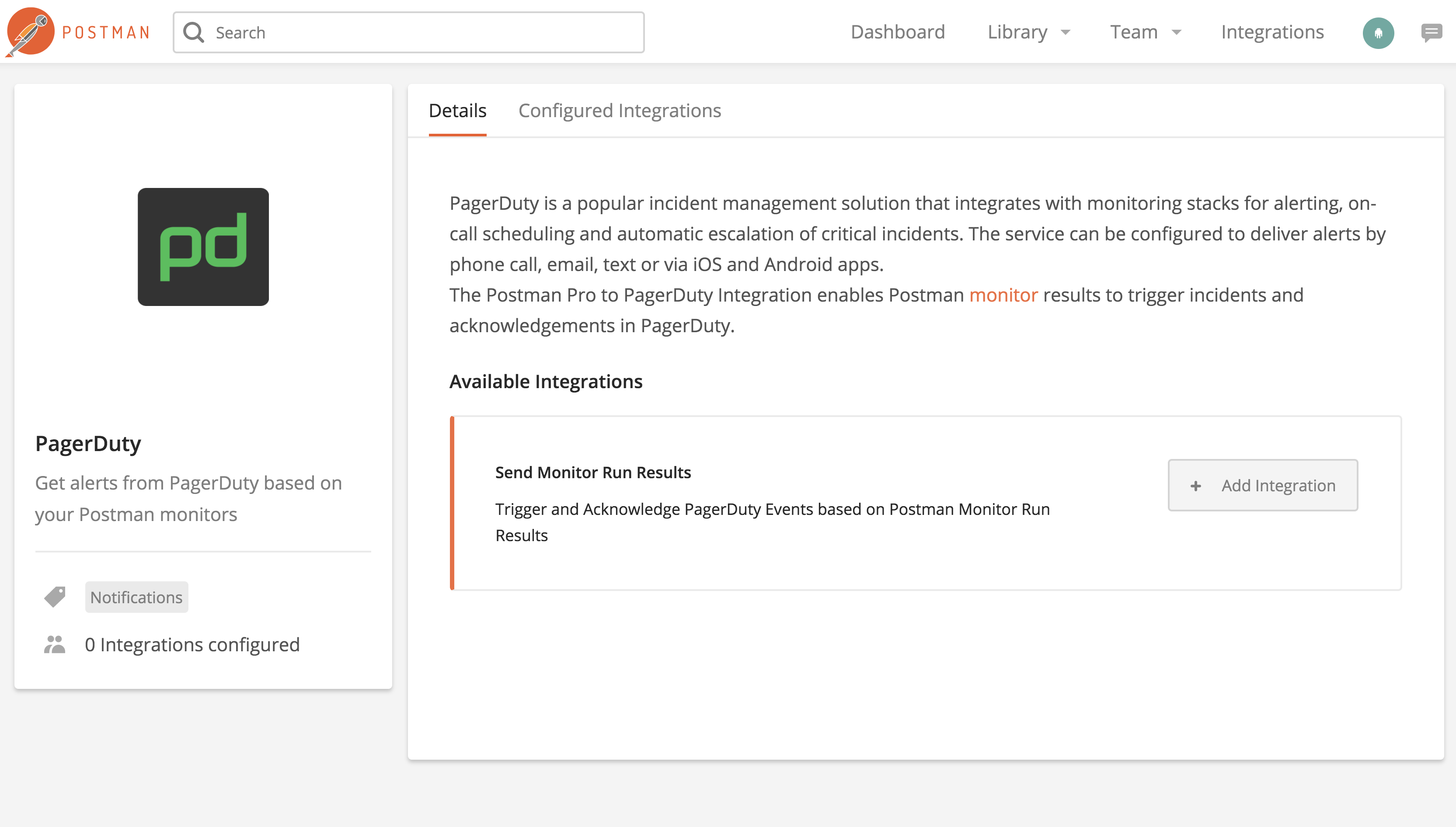 - In the Integrations page, find PagerDuty from a list of Postman's 3rd party Integrations for Postman Pro users.
